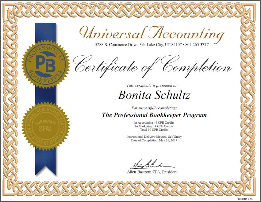 Become a Successful Certified Accounting & Bookkeeping ProfessionalThe Professional BookkeeperTM Certification from Universal Accounting is a unique program, developed specifically for aspiring small business owners. You can complete the entire program from the comfort of your own home and gain the knowledge to get your Bookkeeping and Accounting business off the ground in a matter of weeks.
